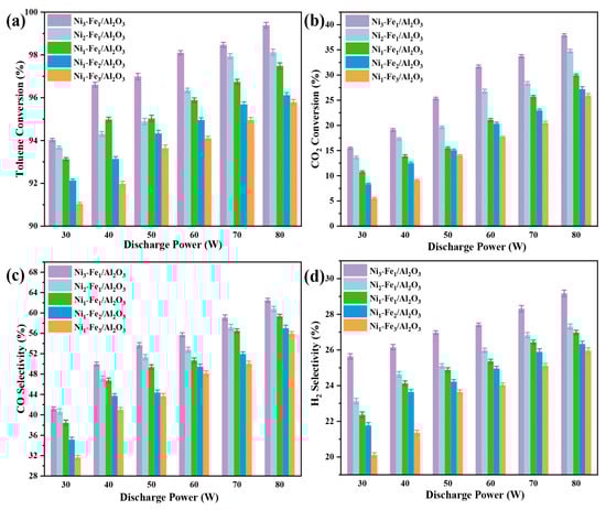 In this study, the effect of varying discharge power on toluene CO2 reforming catalyzed by Nix-Fey/Al2O3 catalysts in a DBD reactor was investigated, with the reaction temperature maintained at 250 °C and a fixed C7H8 concentration. The results show that different Ni/Fe ratios significantly impact both the conversion efficiency of toluene and the energy efficiency of the process. The catalytic performance followed the following order: Ni3-Fe1/Al2O3 > Ni2-Fe1/Al2O3 > Ni1-Fe1/Al2O3 > Ni1-Fe2/Al2O3 > Ni1-Fe3/Al2O3, with Ni3-Fe1/Al2O3 exhibiting the best performance. This superior performance can be attributed to its small particle size (nanometer scale), large specific surface area, and strong alkalinity, all of which contribute to enhanced catalytic activity. When the discharge power is increased from 30 W to 80 W, the toluene conversion and CO2 conversion over Ni3-Fe1/Al2O3 catalyst rise by 6% and 145%, respectively. The selectivity of major gas products, including H2 and CO, exhibited a similar tendency to the toluene conversion (Figure 6c,d). This phenomenon aligns with the findings reported by Xu et al. [47] regarding the use of DBD plasma for toluene reforming. In the plasma environment, the generation of high-energy electrons facilitates the cleavage of chemical bonds within tar molecules, leading to the formation of reactive species that promote the decomposition and reforming of toluene [48]. As discharge power increases, the electric field intensity in the discharge region also increases, leading to a greater abundance of high-energy electrons [49]. This intensifies micro-discharge phenomena and creates additional reaction pathways, facilitating the transformation of toluene into desired products. Thus, under suitable temperature and discharge power conditions, the conversion of toluene and the generation of gas products can be significantly enhanced.