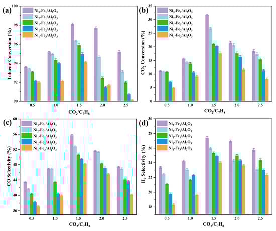 The reaction between CO2 and the carbon deposit on the catalyst surface at high temperatures plays a crucial role in maintaining the catalyst’s activity and stability. To evaluate the impact of CO2 concentration on toluene conversion, experiments were conducted with a fixed plasma discharge power of 60 W, while varying the molar ratio of CO2 to C7H8 from 0.5 to 2.5. The results show that in the CO2/C7H8 range of 0.5–1.5, increasing CO2 concentration led to higher selectivity for CO and H2, as illustrated in Figure 7d. This behavior can be explained by the fact that, with fixed discharge power, total gas flow rate, and reaction temperature, the number of electrons and active species in the plasma remain constant. As the CO2/C7H8 molar ratio increases, each toluene molecule shares more electrons and active species, resulting in a higher conversion of toluene. At a CO2/C7H8 molar ratio of 1.5, the maximum conversions of toluene and CO2 over the Ni3-Fe1/Al2O3 catalyst were achieved, reaching 98% and 32%, respectively. However, when the CO2/C7H8 ratio was further increased to 2.5, the conversion of toluene decreased to 95%, and the selectivity for CO and H2 dropped from 56% to 47% and from 27% to 25%, respectively. This indicates that excess CO2 input negatively affects the overall performance of the plasma-catalytic system, which is consistent with findings from other studies [51].