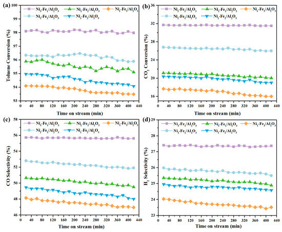(a) Toluene conversion, (b) CO2 conversion, (c) CO selectivity, and (d) H2 selectivity as a function of time on stream over Nix-Fey/Al2O3 catalysts.