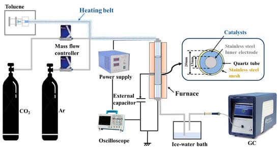 The plasma-catalytic CO2 reforming of toluene was conducted in a coaxial DBD plasma reactor, as shown in Figure 9. The reactor was constructed using a quartz tube with an inner diameter of 13 mm and outer diameter of 20 mm. A mesh stainless steel wire served as the ground electrode and was wound around the outside of the quartz tube, while a high-voltage electrode was positioned inside the tube, creating a discharge gap of 3.5 mm. CO2 and argon were introduced into the reactor using mass flow controllers (MFCs), while toluene was injected via a high-precision syringe pump into a feed line, which was preheated to 200 °C. The reactor was maintained at 250 °C, with thermal insulation provided by a tubular furnace to minimize heat loss. A sinusoidal high-voltage power supply (Suman, Nanjing, China, CTP-2000KP) was used to generate plasma inside the reactor, with a frequency of approximately 9.7 kHz. The discharge power was determined by integrating the Q-U Lissajous diagram, and the input current and voltage were monitored using an oscilloscope (Tektronix, Beaverton, OR, USA, TBS1102C). The voltage was measured through a passive voltage probe (Tektronix, Beaverton, OR, USA, TPP0201) after capacitor voltage division (1:1000). All electrical signals were recorded for analysis. The gas phase composition was analyzed using an online gas chromatograph (Micro GC Fusion, Inficon, Zurich, Switzerland).