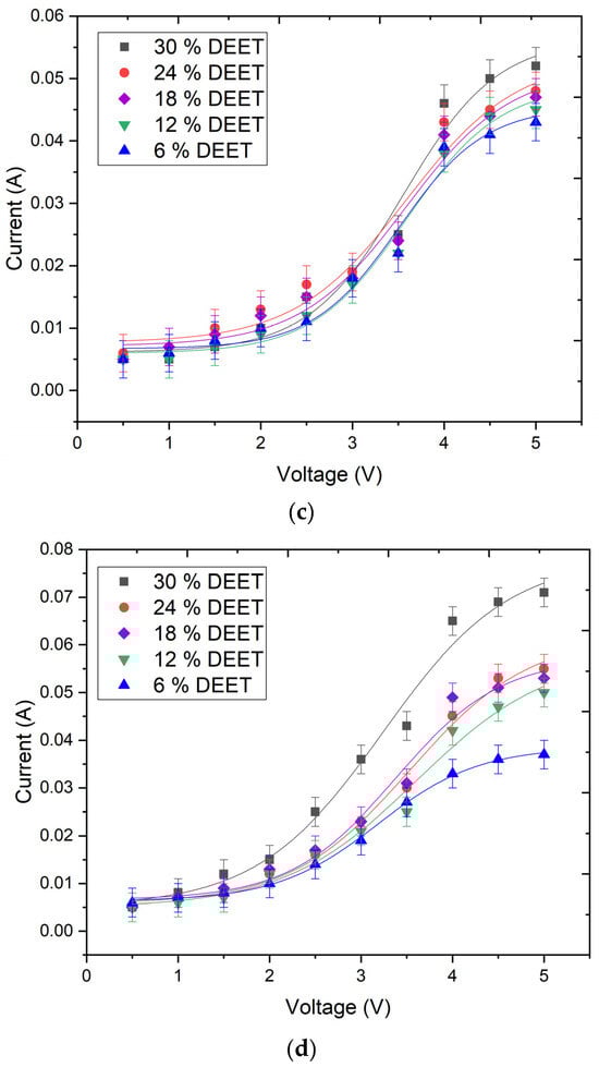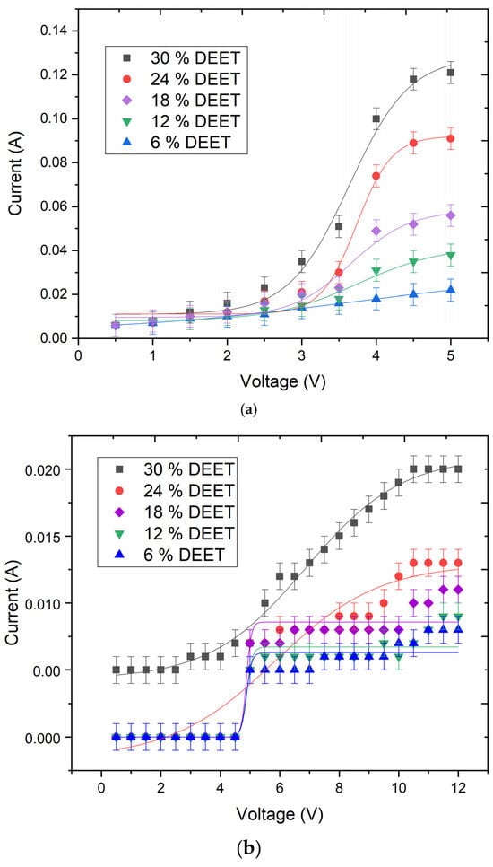 The data obtained as a result of the thermal diffusion of DEET enabled the calculation of the parameters of the electric flux Je (A × m−1), which were caused by direct current action on the material and the formation of a temperature gradient in the material. This effect was formulated in the theories of Peltier and Thompson and allows for the calculation of the thermodynamic parameters of a nonequilibrium system [24]. The values of electric flux (Je) for each material in each application form were calculated and plotted as a function of DEET concentration obtained by thermal diffusion (Figure 6) via these laws and the empirical data obtained. Each data point on the graph represents the value of the DEET concentration obtained by thermal diffusion in the materials at the maximum applied voltage (5.6 and 12.5 V) for each application form considered, containing 6–30 wt% of this repellent.