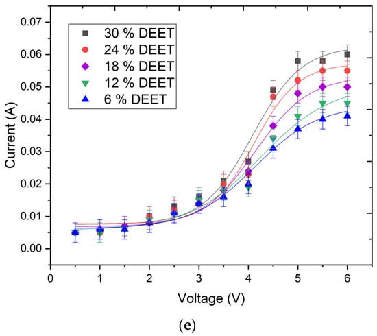 The data obtained indicate that, across all the geometries, the composite containing 30 wt% DEET exhibited superior electrical conductivity compared with the other compositions (Table 3). However, the variation in resistivity values between compositions is not statistically significant. In addition, the geometric shape of the model in which the repellent composite is applied is particularly important in determining the conductivity of the electrical charge. To illustrate this point, consider the material applied in the meander shape. To initiate conduction of electric current, a voltage of more than 5 V is needed. In contrast, a voltage of 2 V is sufficient for other shapes. Conversely, when applied as films with a thickness of 1 mm, the obtained composites are incapable of conducting voltages above 6 V (or 12.5 V for the meander shape), due to significant overheating of the conductor, which subsequently leads to breakdown of the electrical circuit. Consequently, for each geometric shape in which the repellent composites were positioned, a ’voltage range’ was delineated, and further investigations were conducted within this range.