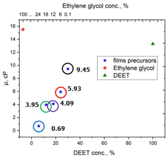 The rheological properties of electrically conductive composite materials with different DEET repellent content can also have a key influence on the controlled release of the substance from the polymer matrix. As part of our research, we studied how the initial DEET concentration affects the composite’s physicochemical and electrical properties. For this purpose, ethylene glycol was utilized as a substitute for DEET, a compound that has been extensively researched and is well-documented [24]. The dynamic viscosity value of ethylene glycol is the closest to that of the DEET repellent among all known compounds of similar rheology. The dynamic viscosity indices (cP) of the repellent precursors with varying DEET concentrations (6–30 wt%) were determined, and the data obtained were then compared, as illustrated in Figure 3.