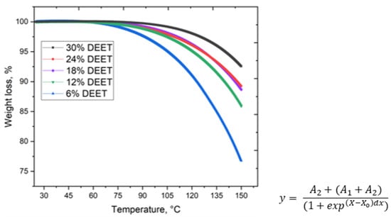 Thermogravimetric analysis (TGA) (STARe Mettler–Toledo, Columbus, OH, USA) was carried out for five samples with different concentration of DEET. The samples were heated to 150 °C at a heating rate of 10 °C/min under air.