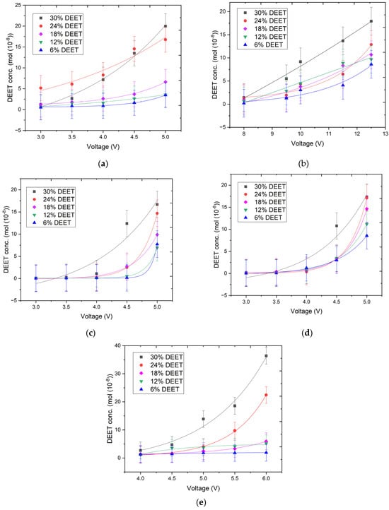 The results demonstrate that, despite the lowest electrical flux value in the meander b shape, the concentration of diffusing DEET can be almost the same as that in the straight strip a, grid c and grid d shapes (where the flux value is much higher). This demonstrates that the repellent composite can be used in a wide variety of practical models, achieving the required target concentrations even in complex application geometries. Conversely, the shortest conductor length of the grid e shape (14 mm) facilitates the rapid heating of the repellent composite, yielding a substantially higher DEET repellent yield. This configuration is sufficient to operate at an electrical voltage of up to 6 V. In this instance, the value of the electric flux is also the highest. This finding indicates that, according to the provisions of Onsager theory, the general flux of a substance is the highest [25]. Therefore, the most effective way to apply a repellent composite material with a controlled yield of N,N-diethyl-3-methylbenzamide has been determined.