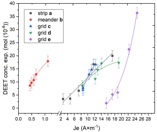 Following the analysis of the obtained data, the DEET concentration values (mol, 10−8) were calculated, and their dependence on the flux Je (A∙m−1) was plotted using the Peltier and Thompson equation [25,26] (1).