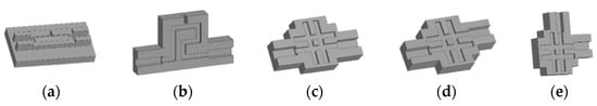 (a–e). Schematic representation of geometrical models (straight strip (a), meander (b), and grids (c–e)) for determination of the voltametric characteristics of composite materials with different content of N,N-diethyl-3-methylbenzamide.