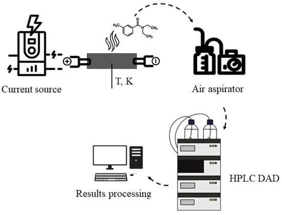 The thermal diffusion of DEET was studied under the conditions described in the determination of the voltametric properties of repellent composites (Section 3.2.6). The results of the voltametric study of electrically conductive materials were used to determine the intervals of the applied electric voltage. The heating temperatures of each composition, material geometry and voltage were thus determined (Figure 5).