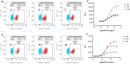 HEK293-TSHR/CRE-Luc and HEK293-TSHR/NFAT-Luc cells responsive to rhTSH. HEK293-TSHR/CRE-Luc and HEK293-TSHR/NFAT-Luc cell lines were analyzed by flow cytometry for the expression of hTSH receptor on the cell surface ((A) and (C), respectively). Three HEK293-TSHR/CRE-Luc monoclones (C2, C5, and C18) and three HEK293-TSHR/NFAT-Luc monoclones (N4, N11, and N9) were stimulated with serially diluted rhTSH ((B) and (D), respectively), and the dose–response curves are shown.