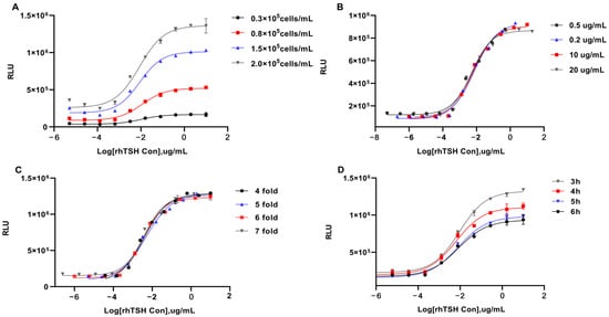 Optimization of the RGAs based on HEK293-TSHR/CRE-Luc cells. HEK293-TSHR/CRE-Luc cells were adjusted to 0.3, 0.8, 1.5, and 2.0 × 104 cells per well and incubated with serial dilutions of rhTSH. The dose–response curves were recorded to determine the optimal cell density (A). Cells were treated with gradient dilution of rhTSH with different initial concentrations (0.5, 0.2, 10, and 20 μg/mL) (B). After fixing the initial concentration at 10 μg/mL, rhTSH was diluted in 4-, 5-, 6-, and 7-fold serial dilutions to 10 concentration levels (C). RLU was measured after the test plates were incubated for different times (3, 4, 5, and 6 h) (D).