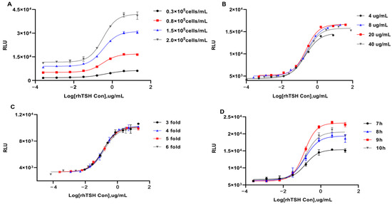Optimization of the RGAs based on HEK293-TSHR/NFAT-Luc cells. The full dose–response curves are shown with the cells seeded at 8000 per well with various initial concentrations as indicated (A). RhTSH was diluted in 3-, 4-, 5-, or 6-fold serial dilutions to generate 10 concentration points, with an initial working concentration of 20 μg/mL. The dose–response curve is shown in (B). The dose–response curve shown was measured in the presence of different cell numbers as indicated (C) and at incubation times of 7, 8, 9, and 10 h shown in (D).