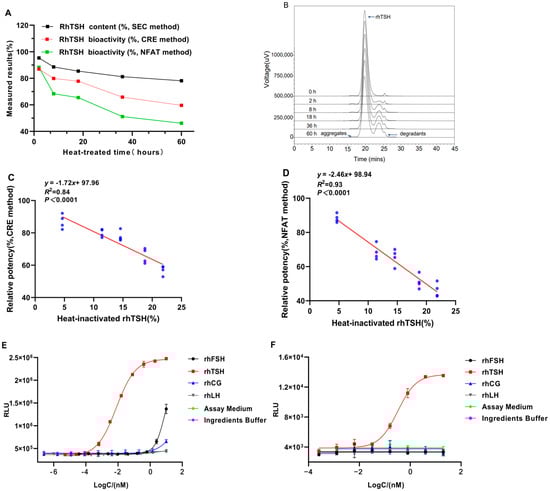 Specificity analysis of two new RGAs. (A) Relative potency estimated for CRE RGA and NFAT RGA, and the content measured via size-exclusion high performance liquid chromatography (SE–HPLC) of rhTSH samples kept at 60 °C for different durations of time (h). (B) Analysis of aggregates, degradants, and rhTSH contents in heat-inactivated samples via SEC–HPLC. Correlation analysis of the heat-inactivated rhTSH content with biological activity obtained using the CRE (C) and NFAT assays (D). Dose–response curves of the ingredients buffer, assay medium, rhFSH, rhTSH, rhCG, and rhLH, as determined with CRE (E) and NFAT RGAs (F).