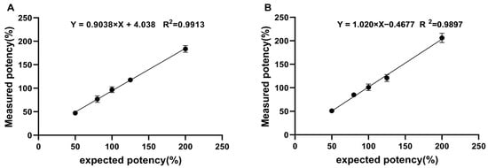 Linear regression was carried out on the natural logarithmic values of the theoretical values of the five potency levels and the natural logarithmic values of their corresponding potency measurements. The results are shown in Figure 5. The linear regression formulas of the two assays are Y = 0.904X + 4.038 (R2 = 0.9913) and Y = 1.020X − 0.468 (R2 = 0.9897). The slopes were close to 1.0, and R2 was greater than 0.98. This shows that the two assays have good linearity within the 50–200% potency level.