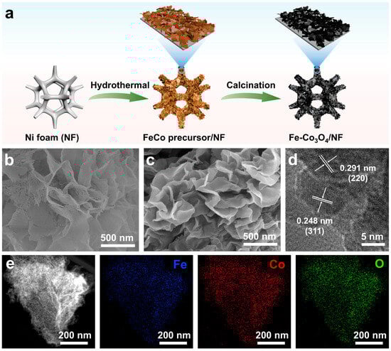 Fe-Co3O4/NF-integrated electrocatalyst was synthesized by two steps of a simple hydrothermal reaction and calcination oxidation process (Figure 1a). Firstly, a bimetallic FeCo precursor/NF with a nanosheet morphology was grown on an NF substrate via a simple solvothermal method. Subsequently, the obtained FeCo precursor/NF was calcined in air at 350 °C for 2 h to prepare the final Fe-Co3O4/NF. For comparison, Co3O4/NF integrated catalyst was prepared using the same synthesis method just without the Fe precursor.