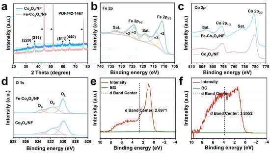 It is well known that the position of the d-band center is directly related to the adsorption energy of the intermediate. This is because the change in the adsorption energy of various intermediates to different metals determines the activity and stability of the electrocatalyst, so the d-band center is an important indicator of HER and OER performance [31]. The approximate d-band center position can be obtained from the valence-band spectra [32]. As shown in Figure 2e,f, the d-band center of Fe-Co3O4/NF is approximately 1.16 eV higher than that of Co3O4/NF. According to the d-band center theory, the increase in the d-band center energy level enhances the adsorption ability of the catalyst surface to the reactive free radicals, which theoretically can improve the activities of HER and OER.