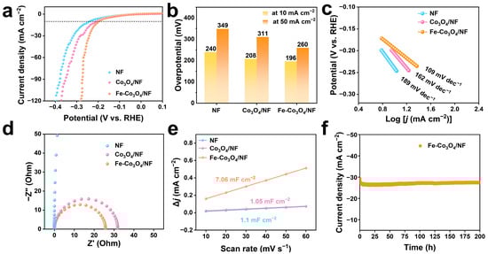 The electrocatalytic HER performance of NF, Co3O4/NF, and Fe-Co3O4/NF was tested in a 1.0 M KOH electrolyte using a typical three-electrode system. As presented in Figure 3a,b, polarization curves are obtained by LSV with a scanning rate of 2 mV s−1. The Fe-Co3O4/NF shows a remarkable catalytic HER activity with a much lower η10 of only 196 mV than Co3O4/NF (η10 = 208 mV) and bare NF (η10 = 240 mV). It is worth noting that at 50 mA cm−2 high current density, the overpotential required for Fe-Co3O4/NF is also lower than that for Co3O4 and NF. Moreover, the Fe-Co3O4/NF exhibits favorable HER kinetics with a Tafel slope of 109 mV dec−1, which is smaller than that of Co3O4 (162 mV dec−1) and NF (189 mV dec−1) (Figure 3c). When the electrode reaction is strongly affected by the diffusion process, such as when the diffusion rate of reactants or products near the electrode surface is slow and cannot be supplemented or removed in time, it will lead to the deviation of the relationship between the current density and the electrode potential from the ideal situation and increase the Tafel slope, which even may exceed 120 mv/dec. EIS measurements reflect the reaction kinetics and conductivity of the catalyst in the HER process, and the fitted Nyquist diagram is shown in Figure 3d. Fe-Co3O4/NF exhibits the smallest charge transfer resistance, demonstrating its desirable reaction kinetics and excellent electrical conductivity. In addition, CV curves for the non-faraday region (Figure S2) are collected to determine the Cdl (Figure 3e, relative to the RHE). The Fe-Co3O4/NF possesses a Cdl of 7.06 mF cm−2, significantly higher than those of Co3O4/NF (1.05 mF cm−2) and NF (1.1 mF cm−2), indicating the exposure of more active sites. Moreover, the stability of the catalyst is also important for practical applications. The durability of the electrocatalysts was assessed using current–time (i–t) chronoamperometric measurement. As shown in Figure 3f, the current density of Fe-Co3O4/NF at 27.5 mA cm−2 exhibits a negligible change during continuous operation over 200 h. The polarization curves also show the same result before and after the 1000-cycle voltammetry cycles (Figure S3).