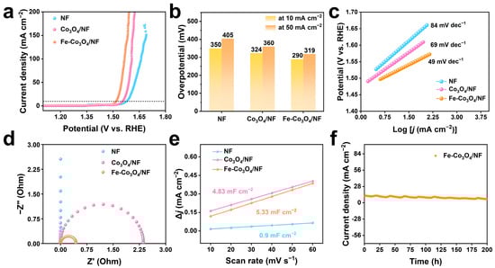 Electrochemical tests of Fe-Co3O4/NF and other catalysts for OER in 1 M KOH solution. (a) The LSV polarization curves at a scan rate of 2 mV. (b) Overpotential at 10 and 50 mA cm−2. (c) Tafel plots of various OER electrocatalysts. (d) EIS spectra. (e) Linear fit of scan rate to capacitive current density of NF, Co3O4/NF, and Fe-Co3O4/NF. (f) The i-t tests performed for various electrocatalysts at the current density of 10 mA cm−2.