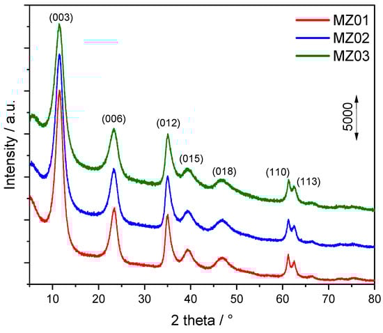 The sample codes as well as the intended cationic and anionic composition of the hydrotalcite-like samples are presented in Table 1, while X-ray diffraction patterns recorded for the non-calcined hydrotalcite-like samples are shown in Figure 1. In the case of all the studied samples, only reflections characteristic of the hydrotalcite structure were identified, indicating successful synthesis of the hydrotalcite-like materials without any additional crystal phases. The average size of the hydrotalcite crystals is about 5.1 nm in the case of MZ01, 4.5 nm for MZ02 and 3.9 nm for MZ03. The average size of crystallites was calculated for 003 and 006 diffraction peaks characteristic of hydrotalcite-like materials (Figure 1).