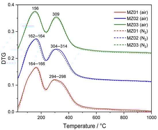 The thermal decomposition of hydrotalcite-like materials to mixed metal oxide systems, used after reduction as catalysts, was studied by thermogravimetric analyses (Figure 2). Thermally induced decomposition of the samples was analyzed in the flow of air (solid line) as well as nitrogen (dashed line). Thermal decomposition of hydrotalcite-like materials is characterized by two main transitions: (1) the loss of interlayer water without collapse of the layered hydrotalcite structure and (2) subsequent loss of hydroxyl groups accompanied by water release from the brucite-like layers and decomposition of volatile interlayer anions, such as carbonates at higher temperatures [,]. The temperature ranges of these two transitions depend on the cationic composition of the hydroxide layers and interlayer anions. The first transition related to the loss of interlayer water is represented by DTG peaks at temperatures below 250 °C. The second stage of hydrotalcite-like samples’ decomposition, including dehydroxylation of the brucite-like layers as well as decomposition of interlayer anions with the evolution of their gaseous products (e.g., in the case of carbonates decomposition CO2 is formed), is represented by DTG peaks centered about 300 °C []. The DTG profiles obtained for the experiments performed in the flow of air (solid line) as well as nitrogen (dashed line) are very similar (Figure 2), indicating that the transformation of hydrotalcite-like materials into mixed metal oxides is induced by temperature, and the gas atmospheres are less important in this case. Based on the results of thermogravimetric analyses, calcination of hydrotalcite-like materials was carried out at 600 °C in an air atmosphere for 12 h.