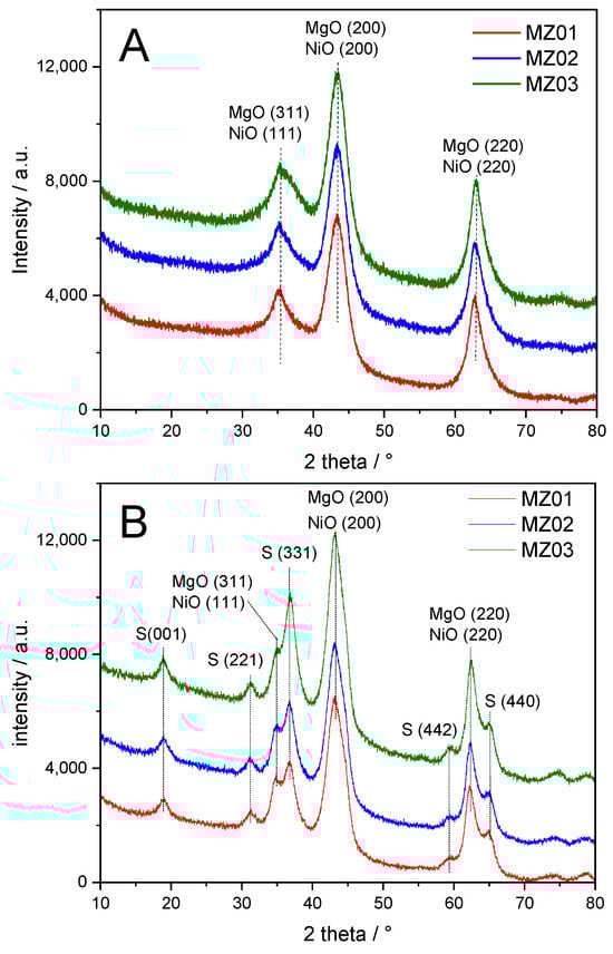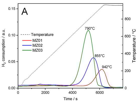 The reducibility of nickel in calcined at 600 °C hydrotalcite-like materials was studied by temperature-programmed reduction method using hydrogen as a reducing agent (H2-TPR). Reduction profiles, presented in Figure 5A, indicate that nickel cations present in the periclase matrix are effectively stabilized, and their reduction is observed above 600 °C []. An increase in nickel content results in a decrease in reduction temperature. For the sample MZ01, the maximum is located at 790 °C, for MZ02 at 855 °C and for MZ03 at about 940 °C. Su et al. [], who studied calcined Ni-Mg-Al hydrotalcite-like materials, reported a similar effect of reduction temperature shift for the materials with the increasing Mg/Ni ratio and explained that this effect by the increase in the number of electrons on the surface of the catalyst through the doping of Mg improves the electron transfer from the carrier surface to the active metal center, thus improving the nickel species stability. Small and broad maxima at about 250–300 °C are possibly associated with the reduction of NiO aggregates weakly interacting with the Mg-Al oxide matrix [,]. The very low intensity of these peaks may indicate that the majority of nickel is incorporated into periclase, and only very small amounts of nickel exist in the form of NiO.