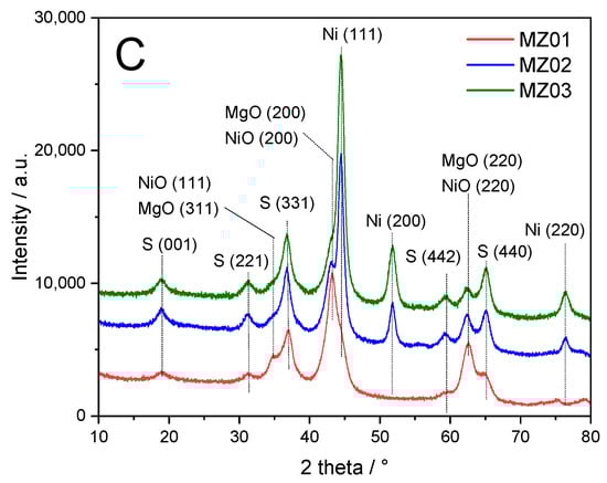 Diffractograms recorded for the samples calcined at 600 and 800 °C as well as after the catalytic test are presented in Figure 3. In diffractograms recorded for the samples calcined at 600 °C in an air atmosphere (Figure 3A), diffraction peaks are characteristic of periclase (MgO) and possibly also nickel oxide (reflections characteristic of NiO overlap with the reflections of MgO) [,]. Of course, the substitution of Ni2+ cations into periclase into positions of Mg2+ cations cannot be excluded due to similar ionic radius (Mg2+—72 pm and Ni2+—75 pm). No reflections indicating the presence of Al2O3, as a separate phase, were found in diffractograms of the calcined samples. A similar effect was reported in our previous papers and was assigned to the incorporation of Al3+ cations into the MgO matrix []. Substitution of Al3+ cations into the positions of Mg2+ cations should result in a positive charging of the matrix, which possibly is compensated by stable CO32− anions. Decomposition of such anions occurs at higher temperatures and is possibly represented by shoulders above 500 °C (Figure 2). An increase in calcination temperature to 800 °C (air atmosphere) resulted in the formation of spinel phases, possibly MgAl2O4, NiAl2O4 and Mg1−xNixAl2O4 [,], proved by the appearance of the specific diffraction peaks (Figure 3B). It should be noted that spinel phases coexist with periclase and possibly also NiO. Very significant changes in diffractograms (Figure 3C) are observed for the catalysts after catalytic tests (the catalysts were moved just after catalytic tests into the XRD chamber and diffractograms were recorded). It should be remembered that prior to the catalytic tests, the catalysts were reduced in a flow of H2/Ar mixture at 800 °C for 12 h, and catalytic tests were conducted in a flow of NH3/He mixture up to 800 °C. Thus, the structural changes in the samples could be induced both by high temperature as well as the presence of hydrogen or ammonia. The comparison of diffractograms presented in Figure 3A,B shows that increased temperature (800 °C) resulted in the formation of spinel phases [,], which are also present in the samples after catalytic tests (Figure 3C). The most intensive diffraction peaks are related to metallic nickel crystallites [,], which possibly were segregated from other phases. In the case of the MZ02 and MZ03 samples, the estimated average size of nickel crystallites (determined for the Ni (200) diffraction peak) was about 8.5–10.1 nm. For the sample with the lowest nickel content, MZ01, the Ni (200) reflection is not present in the diffractogram, and also other diffraction peaks characteristic of metallic nickel crystallites are less intensive compared to those identified in diffractograms recorded for the MZ02 and MZ03 samples (Figure 3C).