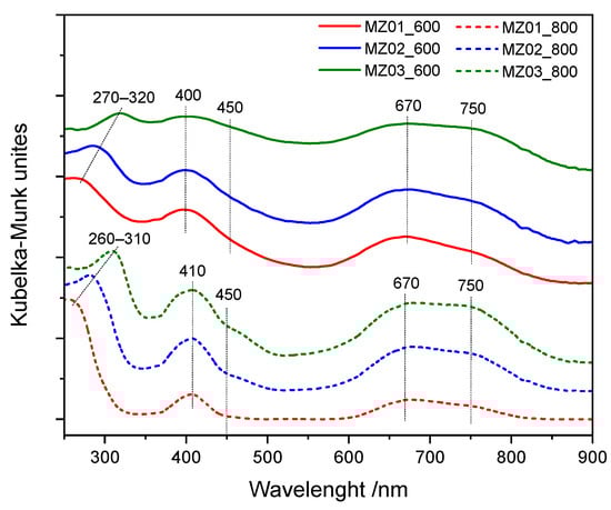 To obtain more information about the structure of the samples, UV-Vis DR spectra were recorded for the samples calcined at 600 and 800 °C (Figure 4). The absorption band located in the range of 260–320 nm, both for the samples calcined at 600 and 800 °C, is assigned to the charge transfer O2−(2p) → Ni2+(3d) in NixMg1−xO oxide []. The location of the band depends on the Ni concentration in such oxide. The bands centered at about 400–410, 670 and 750 nm, in spectra of the samples calcined at 600 and 800 °C, are related to the presence of Ni2+ cations in octahedral coordination and indicate the characteristic 3A2g → 3T1g(P), 3A2g → 1Eg and 3A2g → 3T1g(F) transitions, respectively [,]. These bands could be assigned to Ni2+ species in NiO, as well as in NixMg1−xO, in a wide range of concentrations, including the trace amounts of Ni2+ in MgO.