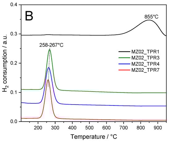 H2-TPR profiles of the samples calcined at 600 °C (A) and reduction profiles of the MZ02 sample recorded in the subsequent H2-TPR runs (B).
