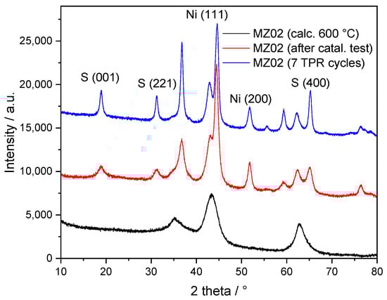 Diffractograms recorded for the MZ02 sample, calcined at 600 °C, after the single catalytic test (reduction at 800 °C and catalytic test) and after seven H2-TPR cycles (to 800 °C) are shown in Figure 6. It should be noted that diffractograms of the MZ02 sample after the H2-TPR cycle and after the catalytic test are very similar and indicate the presence of metallic nickel and spinel phases. The average size of nickel crystallites, determined from Ni(200) reflection, is about 10.3 and 10.5 nm for the MZ02 sample after a single catalytic test and after seven H2-TPR cycles, respectively. Thus, an increase in nickel crystallites took place during the first catalytic cycle and in the subsequent cycles is limited.
