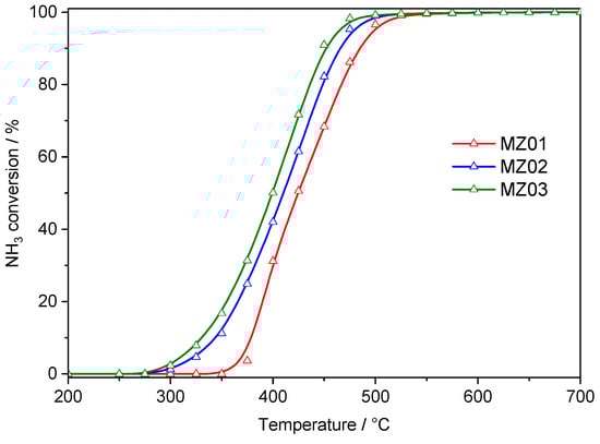 The stability of the MZ03 catalyst under reaction conditions was verified by an isothermal long-term stability test conducted at 450 °C for 23 h (Figure 9). As can be seen during the whole studied period, the ammonia conversion was on the same level, indicating the high stability of this catalyst under ration conditions.