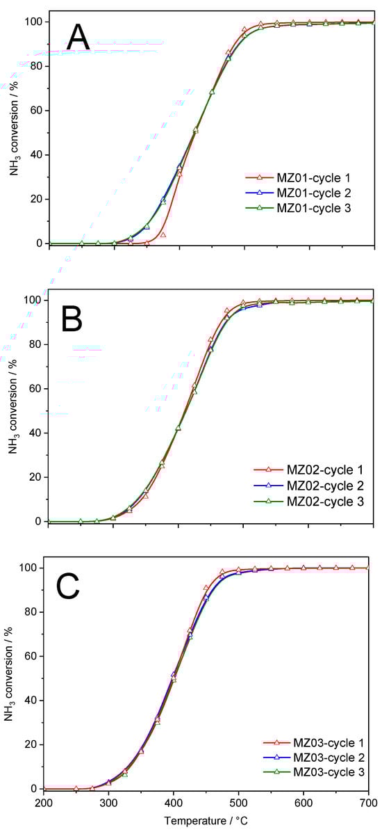 Studies of the catalyst’s stability in the subsequent catalytic cycles of ammonia decomposition reaction in the presence of MZ01 (A), MZ02 (B), and MZ03 (C) catalysts.