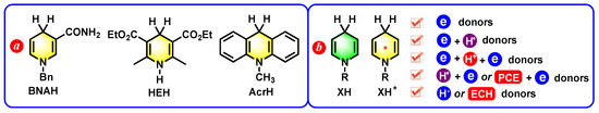 - Fukuzumi, S.; Koumitsu, S.; Katsuhik Hironaka, K.; Tanaka, T. Energetic Comparison between Photoinduced Electron-Transfer Reactions from NADH Model Compounds to Organic and Inorganic Oxidants and Hydride-Transfer Reactions from NADH Model Compounds to p-Benzoquinone Derivatives. J. Am. Chem. Soc. 1987, 109, 305–316. [Google Scholar] [CrossRef]