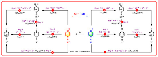 | Step 6 | XH•+ → X• + H+ | ΔHPR(XH•+) | kcal/mol | 12.4 | 4.5 | 9.2 |
