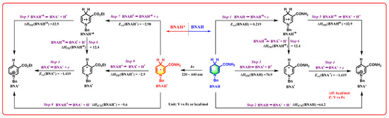 Qian, B.-C.; Zhu, X.-Q.; Shen, G.-B. Thermodynamic Cards of Classic NADH Models and Their Related Photoexcited States Releasing Hydrides in Nine Elementary Steps and Their Applications. Molecules 2025, 30, 1053. https://doi.org/10.3390/molecules30051053