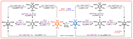 | Step 7 | XH* → XH•+ + e | Eox(XH*) | V vs. Fc | −2.98 | −2.66 | −3.48 |