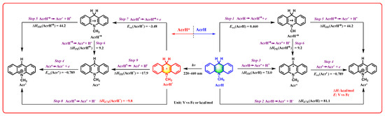 - Ishikawa, M.; Fukuzumi, S. 10-Methylacridine Derivatives Acting as Efficient and Stable Photocatalysts in Reductive Dehalogenation of Halogenated Compounds with Sodium Borohydride via Photoinduced Electron Transfer. J. Am. Chem. Soc. 1990, 112, 8864–8870. [Google Scholar] [CrossRef]