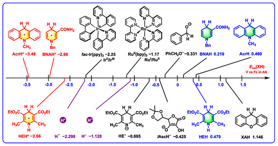 - Zhu, X.-Q.; Zhang, M.-T.; Yu, A.; Wang, C.-H.; Cheng, J.-P. Hydride, Hydrogen Atom, Proton, and Electron Transfer Driving Forces of Various Five-Membered Heterocyclic Organic Hydrides and their Reaction Intermediates in Acetonitrile. J. Am. Chem. Soc. 2008, 130, 2501–2516. [Google Scholar] [CrossRef]