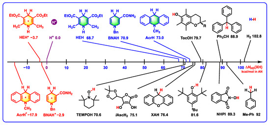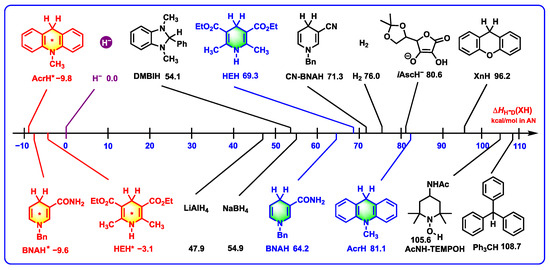 - Shen, G.-B.; Qian, B.-C.; Fu, Y.-H.; Zhu, X.-Q. Thermodynamics of the Elementary Steps of Organic Hydride Chemistry Determined in Acetonitrile and their Applications. Org. Chem. Front. 2022, 9, 6001–6062. [Google Scholar] [CrossRef]