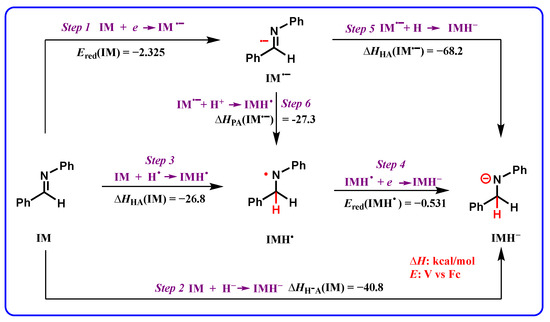 - Zhu, X.-Q.; Liu, Q.-Y.; Chen, Q.; Mei, L.-R. Hydride, Hydrogen, Proton, and Electron Affinities of Imines and Their Reaction Intermediates in Acetonitrile and Construction of Thermodynamic Characteristic Graphs (TCGs) of Imines as a “Molecule ID Card”. J. Org. Chem. 2010, 75, 789–808. [Google Scholar] [CrossRef] [PubMed]