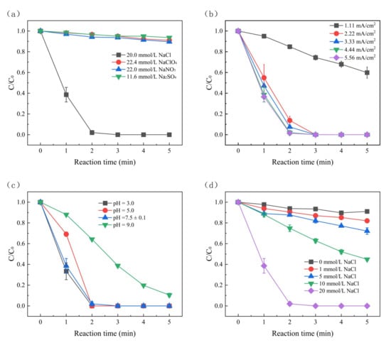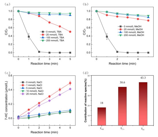 The effect of NaCl concentration on the production of •OH radicals was also investigated. The •OH in this experiment was derived from water oxidation in the anode since no oxidizing agents were added [43]. Coumarin was used as the •OH probe. It can react with •OH to form 7-hydroxycoumarin [44]. As shown in Figure 3c, the •OH yield decreased from 0.50 μmol/L to 0.10 μmol/L after 5 min, while the NaCl concentration increased from 1 mmol/L to 10 mmol/L. However, the change in •OH yield was more affected as NaCl concentration increased from 0 to 1 mmol/L and from 10 mmol/L to 20 mmol/L. This phenomenon could be explained by the fact that NaCl can both promote the production of •OH and react with •OH, and both competing directions exist simultaneously. When the former reaction dominates, •OH production will increase, and vice versa. The low yield of •OH in the system is because no additional oxidant was added. The presence of •OH and Cl− in the system was demonstrated. Based on Equations (1) and (2), it can be concluded that Cl• is also produced in the system.