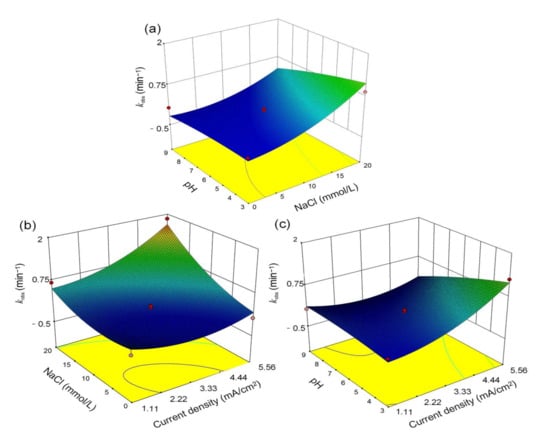 The response surface methodology (RSM) was used to explore the synergistic effects of the parameters current density, NaCl concentration, and initial pH to obtain the optimum operating conditions. Considering the synergistic effects of multiple conditions in actual wastewater treatment, a three-factor, three-level design was employed for the experiment, consisting of 17 experimental runs. The statistical method of Analysis of Variance (ANOVA) was applied to analyze the data and interpret the results to test the model’s hypotheses. As shown in Figure 1c, when the pH values were 7.5 ± 0.1 and 3.0, the degradation rate of the system reached 100%; so it cannot be simply assumed that the effect of pH on the degradation rate of the system is monotonous [38,39]. A second-order polynomial model was applied to study the removal rate of SMX as a function of initial pH, NaCl, and current density, according to Equation (8), where A, B, and C represented the current density, NaCl concentration, and initial pH value, respectively [40,41]. A positive term and a negative term in this model were used to indicate the parameter’s facilitative effect on SMX removal and the inhibitory effect, respectively. As shown in Figure 2, the degradation rate of SMX significantly increased when pH < 9 and the NaCl concentration was above 10 mmol/L. This trend was also observed when the current density exceeded 3.33 mA/cm2, consistent with the previous results on a single variable. In summary, current density and electrolyte concentration played a more important role than the pH conditions in SMX degradation. According to the model predictions, the optimal conditions for SMX removal were for the conditions of a current density of 5.41 mA/cm2, NaCl concentration of 18.18 mmol/L, and pH 3.43, resulting in an SMX degradation kobs of 1.90 min−1. The model reliability test is shown in Text S2.