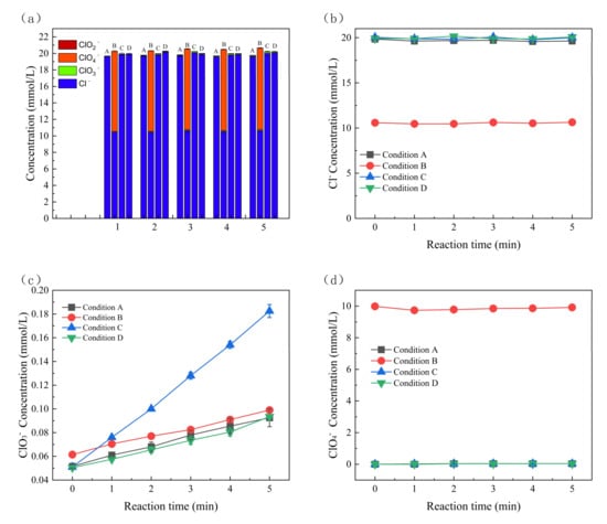 Figure 3d and Text S3 show the relative contributions of •OH and Cl• to SMX, respectively. The degradation contributions were 17.98% and 38.58% by •OH and Cl•, respectively. The general contribution of other reactive substances and non-radicals (e.g., direct electron transfer (DET) on the anode) to SMX degradation was 43.44%. This indicates that Cl• plays a significant role in the degradation of SMX in the electro-oxidation system. The content of Cl−, ClO2−, ClO3−, and ClO4− was analyzed by ion chromatography to examine their changes under different reaction conditions during the reaction process. The detection of ClO2− and ClO4− was mainly investigated to examine whether the system produced additional byproducts that were harmful to the environment. As illustrated in Figure 4a, the total sum of elemental chlorine remained relatively constant, which suggests that the BDD electrode and graphite electrode used in the experiment had minimal adsorption effects, thereby powerfully demonstrating the significant degradation effect of the present degradation system. As shown in Figure 4b–d, the concentrations of Cl− and ClO4− remained relatively stable over time during the reaction, and the concentration of ClO4− in the system was almost zero. This is because the formation of ClO4− usually requires a higher electric potential, with sufficient oxygen or excess chlorate in the system [46]. In this reaction system, Cl− was not excessively converted to ClO4−, which avoided the impact of the degradation process on the environment.