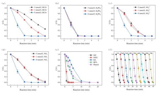 Figure 6a–d shows the SMX degradation results with the addition of low concentrations of HCO3−, H2PO4−, SO42−, and NO3−, respectively. All of them had little effect on the degradation of SMX in the built electro-oxidation system, indicating that this system has strong potential for practical application. This is because their anions can react with •OH [53,54], which could also produce other free radicals such as sulfate radicals [55] and H2PO4− radicals [56].