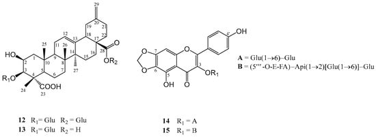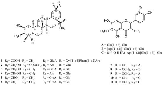 The pharmacologically tested saponins, 3-O-β-D-glucuronopyranosyl-medicagenic acid-28-O-β-D-xylopyranosyl(1→4)-α-L-rhamnopyranosyl(1→2)-α-L-arabinopyranosyl ester 1, Bonushenricoside A 2, 3-O-β-D-glucuronopyranosyl-bayogenin-28-O-β-D-glucopyranosyl 3, 3-O-α-L-arabinopyranosyl-bayogenin-28-O-β-D-glucopyranosyl ester 4, 3-O-β-D-glucuronopyranosyl-2β-hydroxygypsogenin-28-O-β-D-glucopyranosyl ester 5, and Bonushenricoside B 6 were isolated from the roots of C. bonus-henricus L. [3]. The tested flavonoids, patuletin-3-O-gentiobioside 7, spinacetin-3-O-[β-apiofuranosyl (1→2)]-β-glucopyranosyl(1→6)-β-glucopyranoside 8, spinacetin-3-O-gentiobioside 9, patuletin-3-O-(5‴-O-E-feruloyl)-β-D-apiofuranosyl(1→2)[β-D-glucopyranosyl (1→6)]-β-D-glucopyranoside 10, and spinacetin-3-O-(5‴-O-E-feruloyl)-β-D-apiofuranosyl (1→2)[β-D-glucopyranosyl(1→6)]-β-D-glucopyranoside 11 were previously isolated from the aerial parts of the same plant [2]. The other investigated saponins (3-O-β-glucopyranosyl-2β,3β-dihydroxy-30-noroleane-12,20(29)-diene-23,28-dioic acid 28-O-β-glucopyranosyl ester 12 and 3-O-β-D-glucopyranosyl-2β,3β-dihydroxy-30-noroleane-12,20(29)-diene-23,28-dioic acid 13) and flavonoids (gomphrenol-3-O-β-gentiobioside 14 and gomphrenol-3-O-(5′′′-O-E-feruloyl)-β-D-apiofuranosyl (1→2)[β-D-glucopyranosyl-(1→6)]-β-D-glucopyranoside 15) were previously isolated from the aerial parts of C. foliosum [8,9,10].