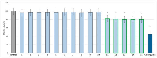 Effects of the compounds 1–15 and the positive control chlorgyline (administered alone at 1 µM concentration) on human recombinant MAOA enzyme (hMAOA) activity. * p < 0.05; *** p < 0.001 vs. control (pure hMAOA). The green color indicates the active compounds.