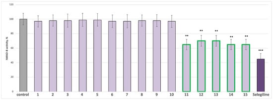 Effects of the compounds 1–15 and the positive control selegiline (administered alone at 1 µM concentration) on the activity of the human recombinant MAOB enzyme (hMAOB). ** p < 0.01; *** p < 0.001 vs. control (pure hMAOB). The green color indicates the active compounds.