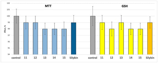 The neurotoxicity of the compounds 11–15 and the positive control silybin on biomarkers, characterizing the functional–metabolic profile of brain synaptosomes, was investigated. When administered alone, at a relatively high concentration (100 µM), compounds 11–15 did not exhibit a statistically significant neurotoxic effect on isolated rat brain synaptosomes. They do not statistically significantly change the main parameters characterizing the functional–metabolic status of synaptosomes—the synaptosomal vitality determined by MTT-test and the level of reduced glutathione (GSH) (Figure 5).