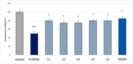 Effects of the tested compounds 11–15 (50 μM) and the positive control silybin (50 μM) in combination with 6-OHDA (150 μM) on synaptosomes viability at isolated rat brain synaptosomes. *** p < 0.001 vs. control (non-treated synaptosomes); +p < 0.05 vs. control (pure 6-OHDA).