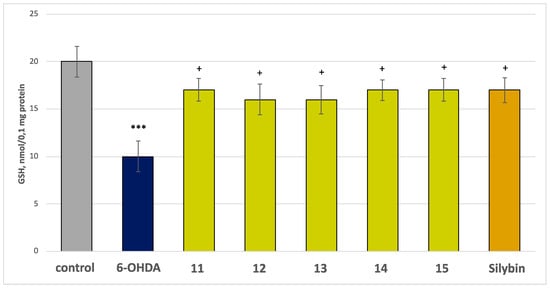 Effects of the tested compounds 11–15 (50 μM) and the positive control silybin (50 μM) in combination with 6-OHDA (150 μM) on GSH level at isolated rat brain synaptosomes. *** p < 0.001 vs. control (non-treated synaptosomes); +p < 0.05 vs. control (pure 6-OHDA).