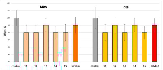 When administered individually at a concentration of 100 μM, compounds 11–15 and silybin did not show statistically significant neurotoxic effects on isolated rat brain mitochondria. Additionally, these compounds did not produce significant changes in the key biomarkers that indicate the functional and metabolic status of mitochondria, namely the production of malondialdehyde (MDA) and the level of reduced glutathione (GSH) (Figure 8).