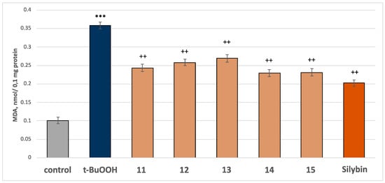 Effects of the tested compounds 11–15 and the positive control silybin, at a concentration of 50µM, in combination with t-BuOOH (75 µM) on MDA production at isolated rat brain mitochondria. *** p < 0.001 vs. control (non-treated mitochondria); ++ p < 0.01 vs. control (pure t-BuOOH).